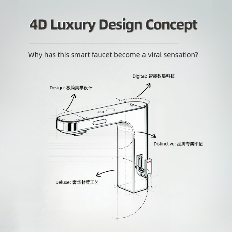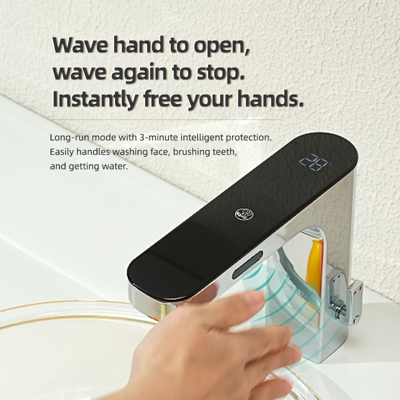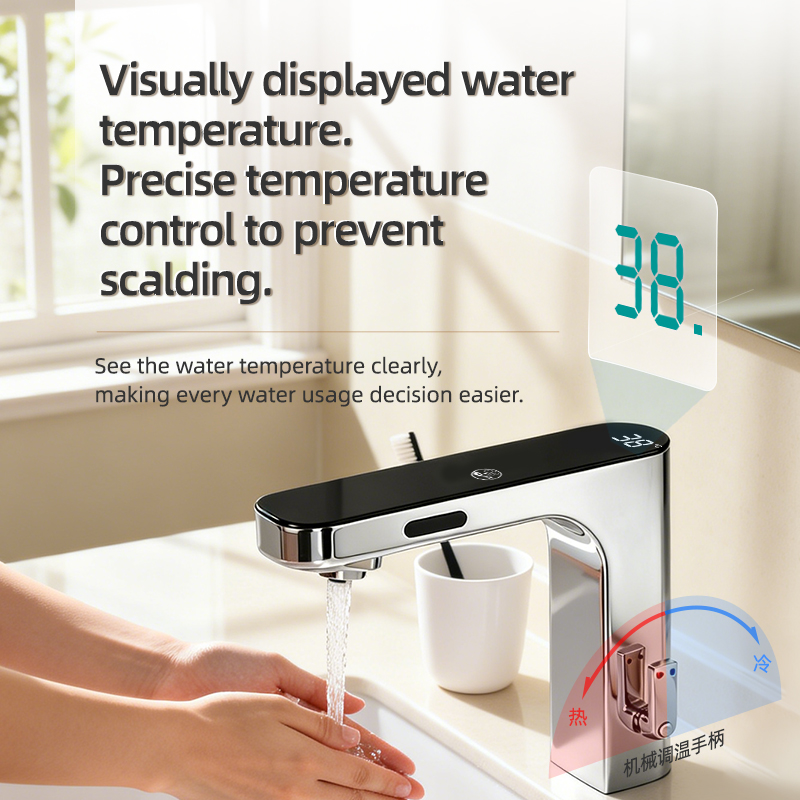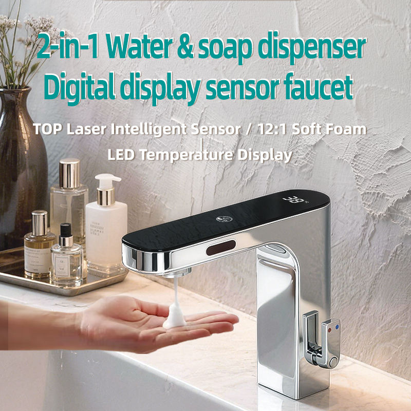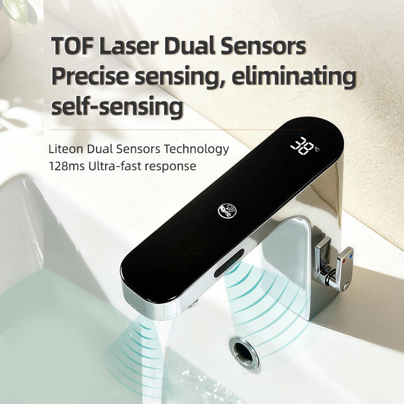 Water and soap dispensing in one faucet & Temperature digital display sensor faucet & TOF Laser intelligent sensor & Liteon dual sensing technology.